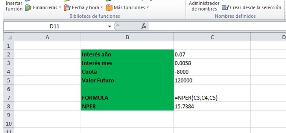 En este ejemplo se omite el argumento “va” porque al principio no se ha invertido ninguna cantidad. También se omite el argumento “tipo”, indicando que los pagos se efectúan al final del periodo. La función devuelve 15,7384, es decir, que se deben hacer pagos de 8,000.00 Soles durante 16 meses aproximadamente.