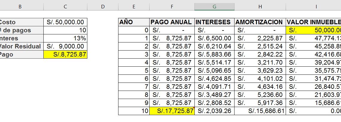Para este caso vamos a trabajar con un Leasing de 10 pagos anuales con un interés del 13% anual. El camión costará S/50,000 y el Valor Residual será de S/ 7.500.
