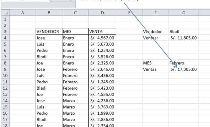 La celda G4 que contiene la función SUMAR.SI muestra la suma de las ventas que pertenecen a José y excluye el resto de celdas. Podría modificar un poco esta fórmula para obtener las ventas de un mes específico. Observa el resultado de esta adecuación en la celda G9: