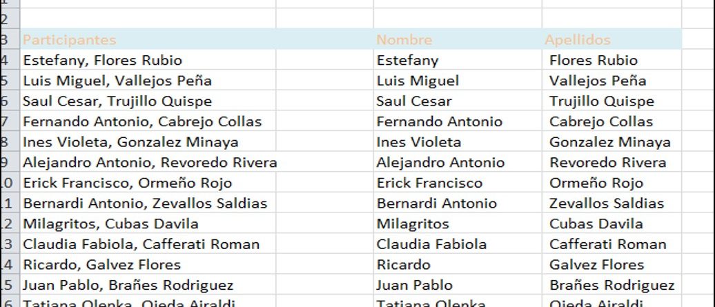 Al principio de este artículo mencioné que el comando Texto en columnas es utilizado por algunos usuarios de Excel para separar nombres y apellidos, así que quiero terminar con un ejemplo que ilustre este caso.